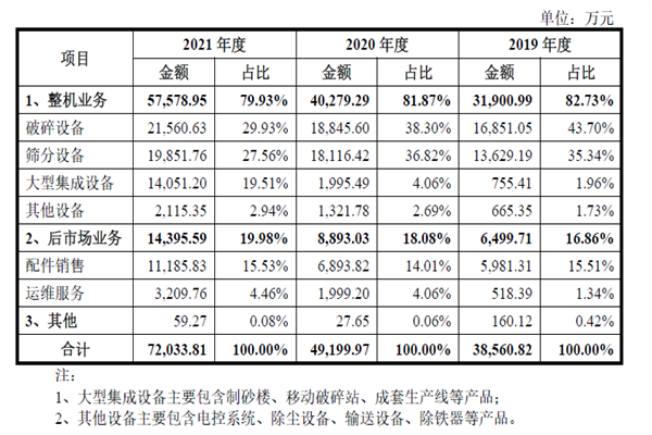 南昌礦機(jī)主要業(yè)務(wù)類(lèi)型為整機(jī)業(yè)務(wù)、配件銷(xiāo)售、運(yùn)維服務(wù)等三種業(yè)務(wù)模式。整機(jī)業(yè)務(wù)方面,2019年、2020年、2021年的營(yíng)收分別達(dá)到31900.99萬(wàn)元、40279.29萬(wàn)元、57578.95萬(wàn)元,其中2021年較2020年整機(jī)業(yè)務(wù)增幅高達(dá)43%,大型集成設(shè)備銷(xiāo)售收入的劇增是主要原因。2020年大型集成設(shè)備銷(xiāo)售收入為1995.49萬(wàn)元,僅占公司營(yíng)收的4.06%,2021年就達(dá)到14051.20萬(wàn)元,占到公司營(yíng)收的19.51%。此外,破碎設(shè)備、篩分設(shè)備的銷(xiāo)售逐年穩(wěn)步提升,仍是南昌礦機(jī)主要的營(yíng)業(yè)收入構(gòu)成。