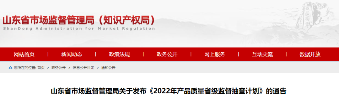 山東省市場監督管理局關于發布《2022年產品質量省級監督抽查計劃》的通告