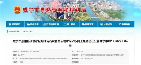 據了解,5月10日,湖北省咸寧市自然資源和規劃局發布咸寧市崇陽縣沙墩礦區熔劑用石灰巖白云巖礦采礦權網上掛牌出讓公告,其中建筑石料用石灰巖保有資源量近6000萬噸,生產規模365萬噸/年,出讓15.9年,掛牌起始價1.2億元。