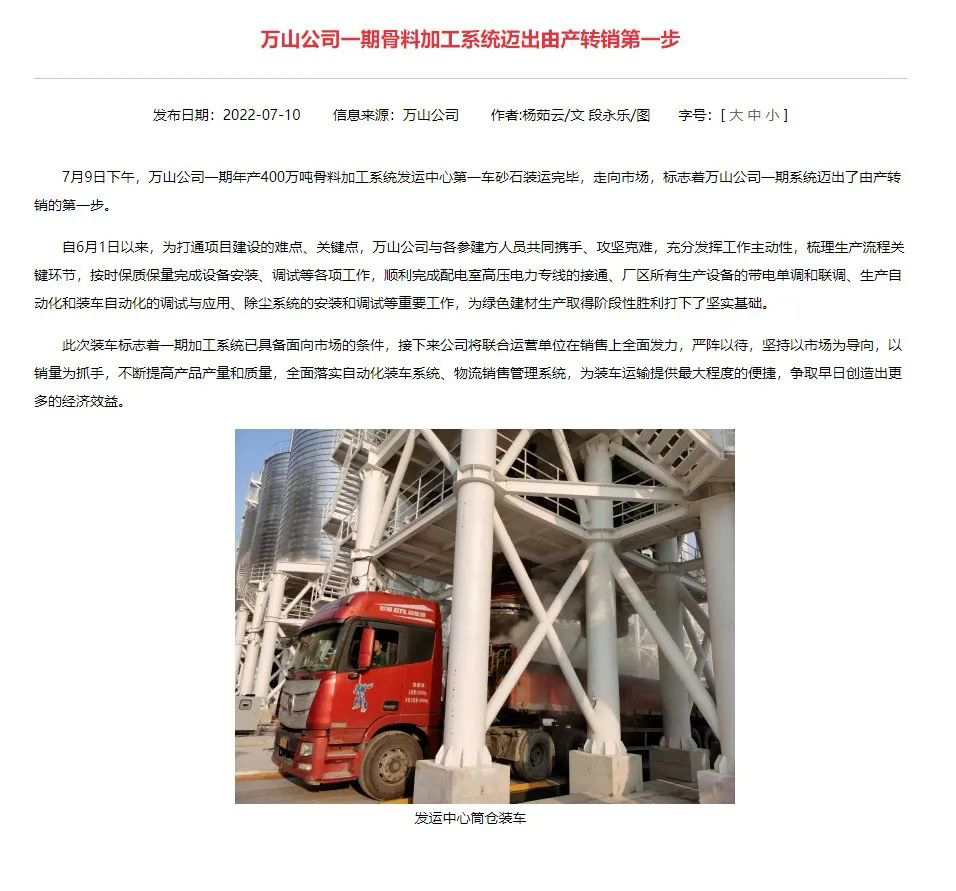 根據中電建河南萬山綠色建材有限公司公開消息,7月9日下午,萬山公司負責投建營的規劃年產2000萬噸偃師市府店鎮東山項目一期年產400萬噸骨料加工系統發運中心第一車砂石裝運完畢,走向市場,標志著萬山公司一期系統邁入了由產轉銷的第一步。
