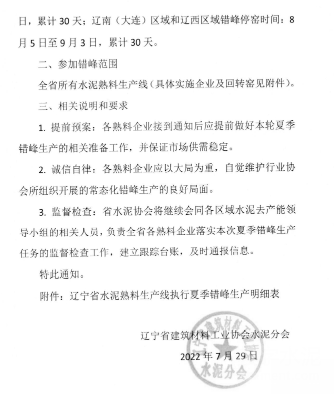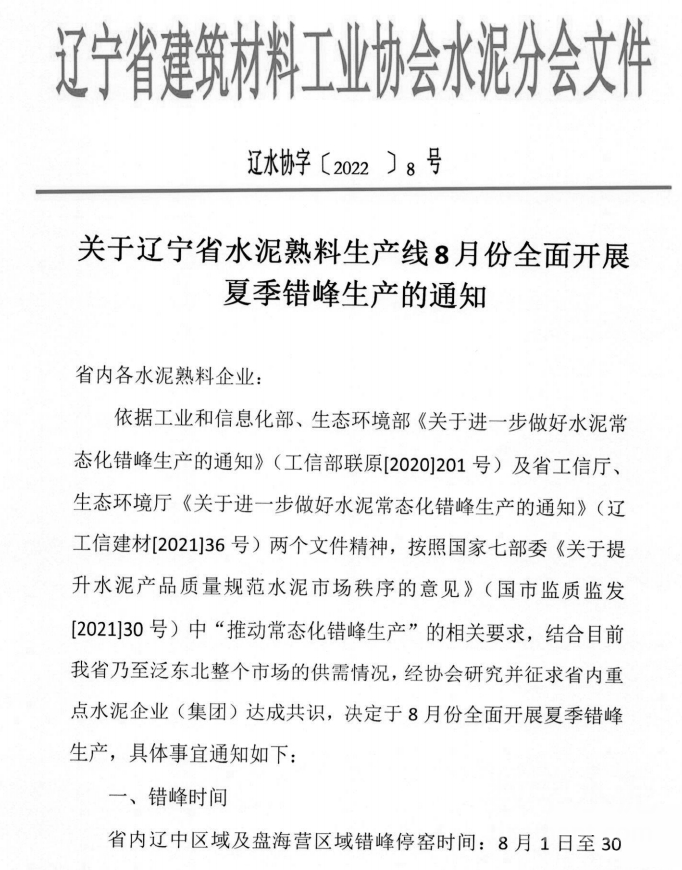 7月29日,根據(jù)遼寧省建筑材料工業(yè)協(xié)會水泥分會發(fā)布《關(guān)于遼寧省水泥熟料生產(chǎn)線8月份全面開展夏季錯峰生產(chǎn)的通知》顯示,全省所有水泥熟料生產(chǎn)線8月份全面開啟錯峰生產(chǎn),省內(nèi)遼中區(qū)域及盤海營區(qū)域錯峰時間為8月1日至30日,累計30天;遼南(大連)區(qū)域和遼西區(qū)域錯峰生產(chǎn)時間為8月5日至9月3日,累計30天。
