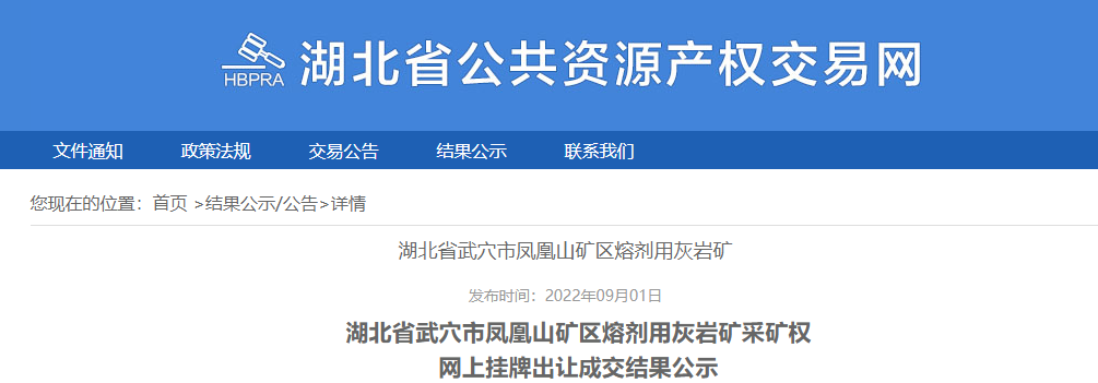 湖北省武穴市鳳凰山礦區熔劑用灰巖礦采礦權網上掛牌出讓成交結果公示