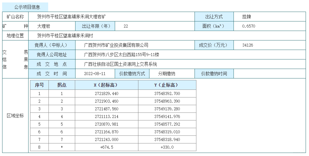 8月11日,廣西省賀州市平桂區望高鎮茅禾洞大理巖礦成功出讓,擬出讓22年(已含0.28年基建期),起始價34126萬元,廣西賀州市礦業投資集團有限公司以34126萬元拿下。