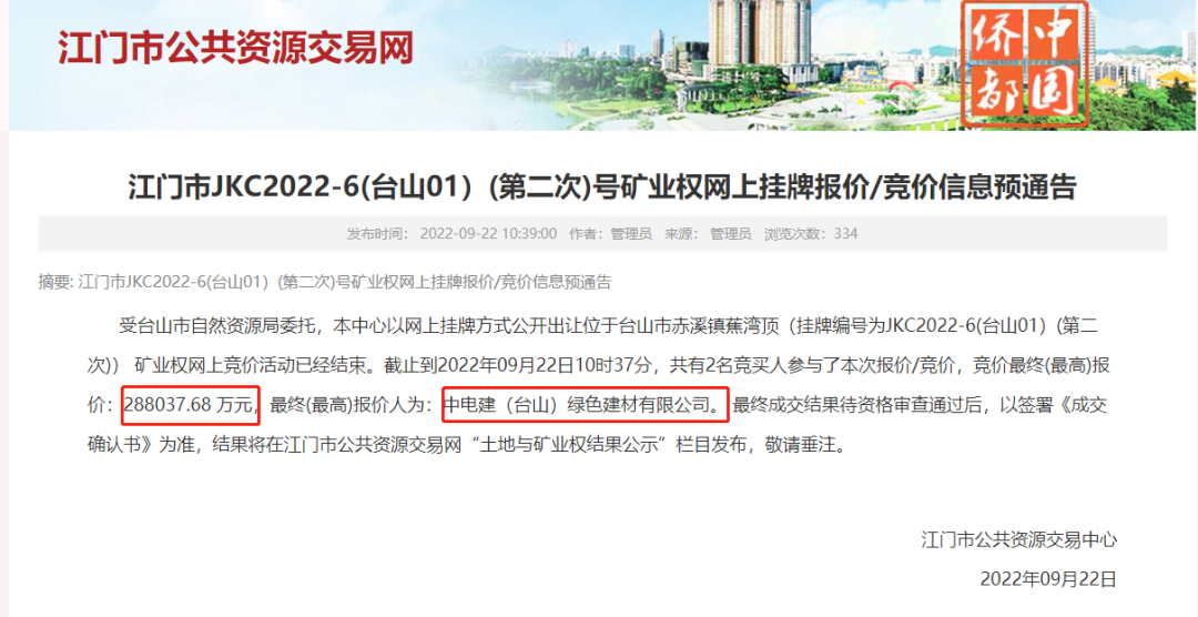 廣東江門臺山市赤溪鎮蕉灣頂(掛牌編號為JKC2022-6(臺山01)(第二次)) 礦業權被中電建(臺山)綠色建材有限公司以28.8億競得。本次采礦權出讓起始價185737.68萬,最低增價幅度為1860萬元/次。最終,溢價55%。