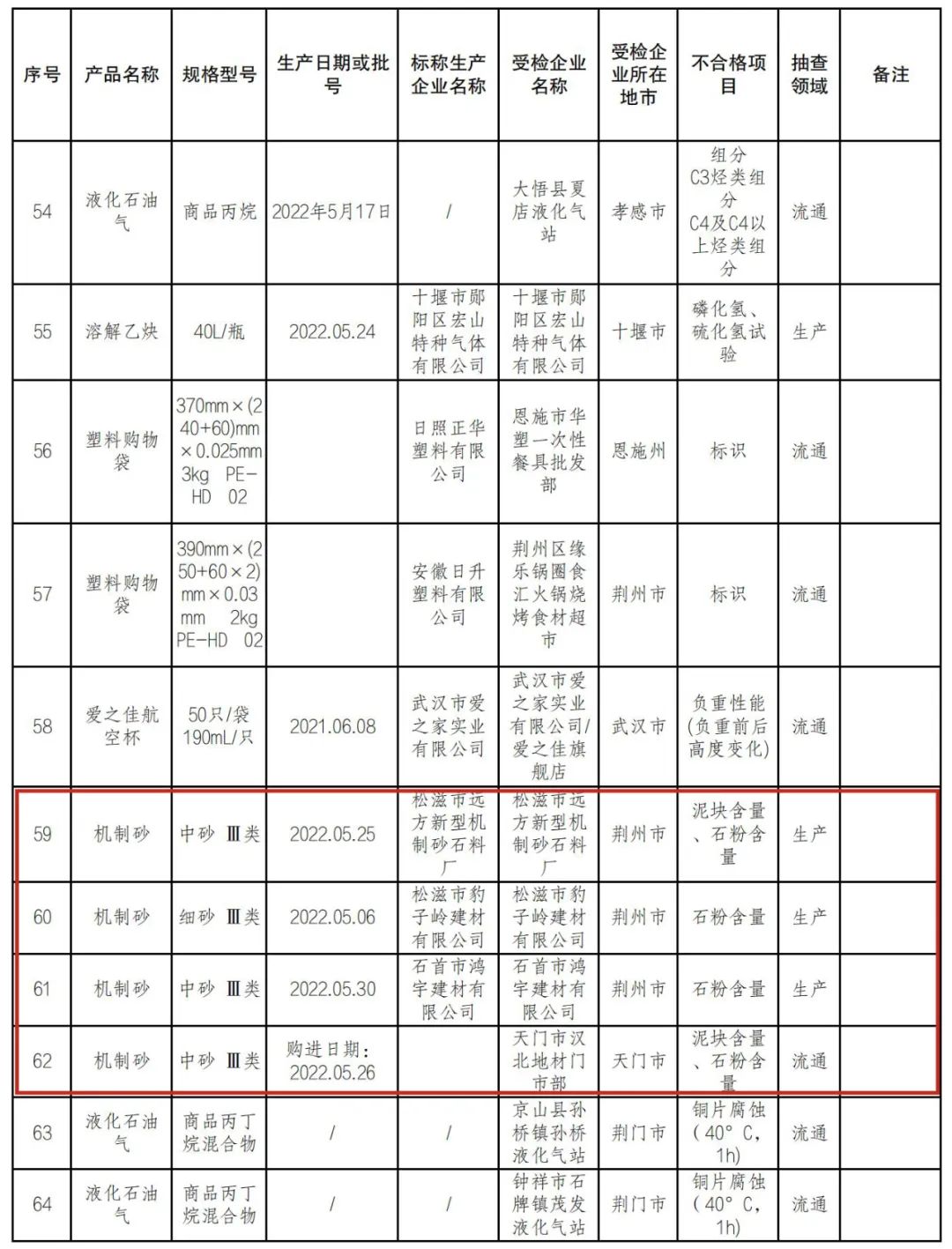近日,湖北省市場監管局通報建設用砂(機制砂)等54種工業產品質量監督抽查結果。其中,抽查17家企業生產或銷售的20批次機制砂,檢測發現4批次產品不合格,不合格項目為泥塊含量、石粉含量。