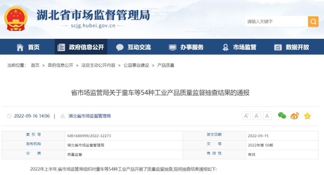 2022年童車等54種工業產品質量省級監督抽查不合格產品及企業名單