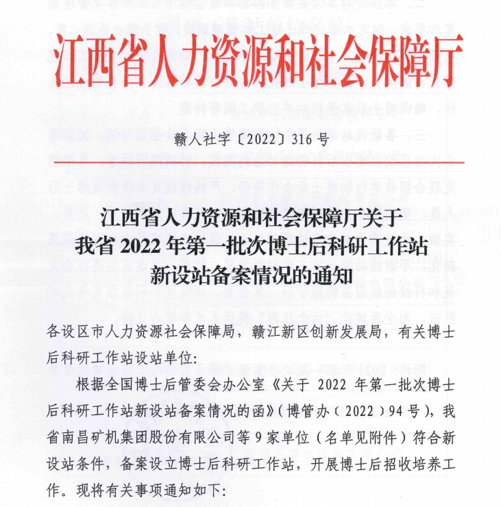 近日,從江西省人力資源和社會保障廳獲悉,全國博士后管理委員會辦公室印發(fā)《關(guān)于2022年第一批次博士后科研工作站新設(shè)站備案情況的函》,南昌礦機集團股份有限公司(下稱“南昌礦機”)榮列其中,獲批設(shè)立博士后科研工作站,系南昌市此次唯一一家入選企業(yè)。這也是南昌礦機在科研平臺建設(shè)和高層次人才培養(yǎng)方面取得的又一重要成果。
