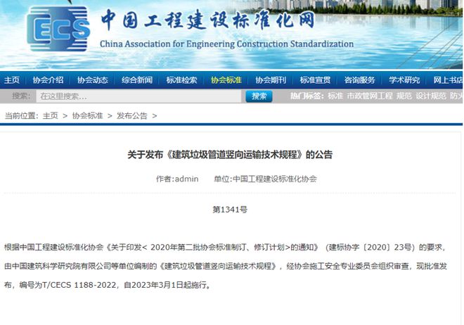 近日,由中建一局二公司參與編制的《建筑垃圾管道豎向運(yùn)輸技術(shù)規(guī)程》,經(jīng)中國(guó)工程建設(shè)標(biāo)準(zhǔn)化協(xié)會(huì)組織審查,現(xiàn)批準(zhǔn)發(fā)布,編號(hào)為T/CECS 1188-2022,自2023年3月1日起施行。