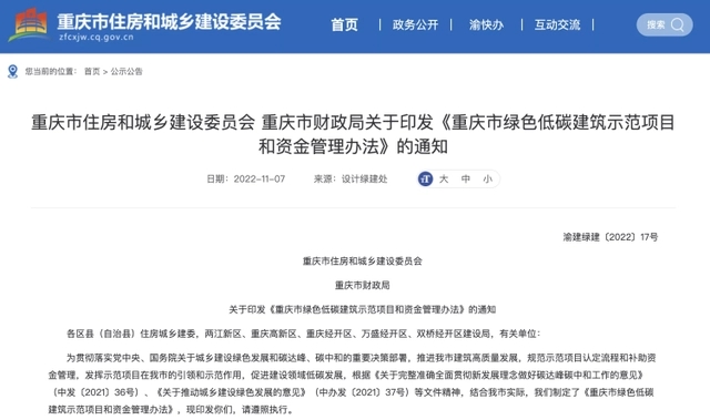 11月9日,上游新聞?dòng)浾邚闹貞c市住房城鄉(xiāng)建委獲悉,為促進(jìn)建設(shè)領(lǐng)域綠色低碳發(fā)展,發(fā)揮示范項(xiàng)目在重慶市的引領(lǐng)和帶動(dòng)作用,日前,重慶市住房城鄉(xiāng)建委與重慶市財(cái)政局共同出臺(tái)了《重慶市綠色低碳示范項(xiàng)目和資金管理辦法》(以下簡(jiǎn)稱《辦法》)。根據(jù)《辦法》,重慶將對(duì)綠色建筑示范項(xiàng)目、近零能耗建筑示范項(xiàng)目、可再生能源區(qū)域集中供冷供熱示范項(xiàng)目及既有公共建筑綠色化改造示范項(xiàng)目給予財(cái)政補(bǔ)助資金,最高補(bǔ)助1500萬(wàn)元。