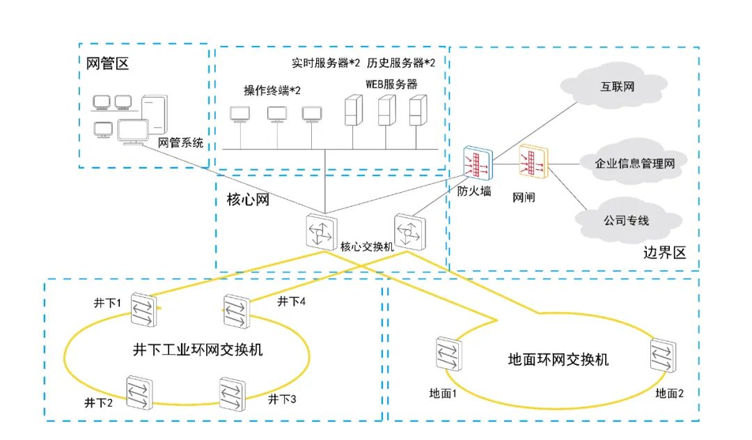 工業(yè)環(huán)網(wǎng)是礦井各項生產(chǎn)數(shù)據(jù)傳輸?shù)暮诵南到y(tǒng),是實現(xiàn)智能化的首要基礎(chǔ)。根據(jù)《陜西省煤礦智能化建設指南(試行)》通知要求,智能化煤礦主干環(huán)網(wǎng)傳輸帶寬不低于10000Mbps。此次震有科技為神木嘉元煤礦建設的萬兆環(huán)網(wǎng)能夠滿足礦井生產(chǎn)各類數(shù)據(jù)傳輸?shù)男枨螅瑢崿F(xiàn)井上井下信息的聯(lián)通。