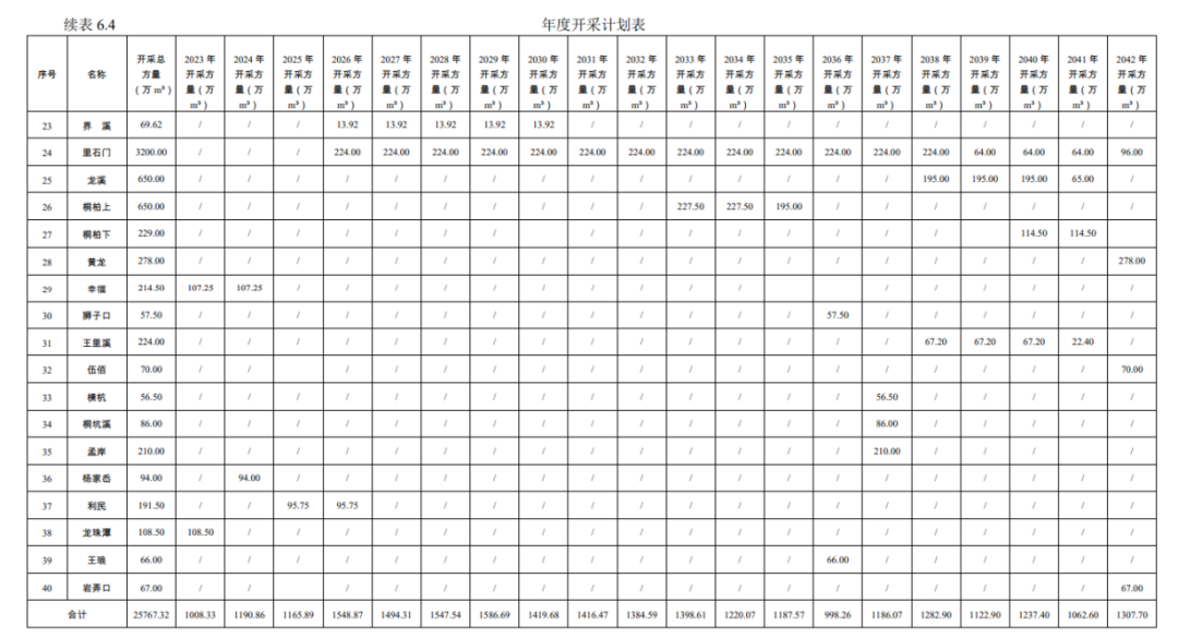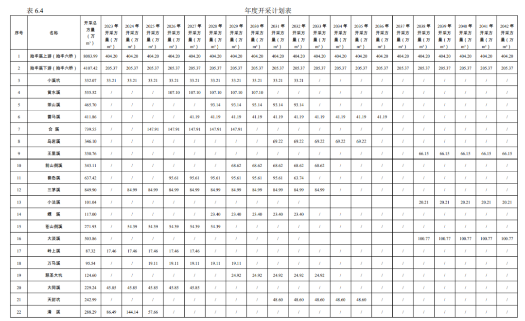 根據本次河道采砂規劃,結合每年汛期后河道的沖刷狀況、砂石分布特點,以及全年年度砂石使用總量預測等實際情況,在確保沿岸農田及在建及擬建工程建筑安全的前提下,對不同采砂區分年度計劃實施。2023年開采總方量約為1008.33萬m,2024年開采總方量約為1190.86萬m,2025年開采總方量約為1165.89萬m,2026年開采總方量約為1548.87萬m,2027年開采總方量約為1494.31萬m,2028年開采總方量約為1547.54萬m,2029年開采總方量約為1586.69萬m,2030年開采總方量約為1419.68萬m,2031年開采總方量約為1416.47萬m,2032年開采總方量約為1384.59萬m,2033年開采總方量約為1398.61萬m,2034年開采總方量約為天臺縣采砂規劃(2023年~2042年)浙江宏圖水利設計有限公司851220.07萬m,2035年開采總方量約為1187.57萬m,2036年開采總方量約為998.26萬m,2037年開采總方量約為1186.07萬m,2038年開采總方量約為1282.90萬m,2039年開采總方量約為1122.90萬m,2040年開采總方量約為1237.40萬m,2041年開采總方量約為1062.60萬m,2042年開采總方量約為1307.70萬m。