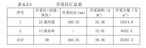 本次規劃劃定的可采區39個,其中河道22條,累計可采區長度約265.25km,水庫17座,開采面積38.38k㎡,符合可采區規劃原則:規劃期內可采區可采砂總量約為25767.3萬m?。分二十年期實施(2023年~2042年)。
