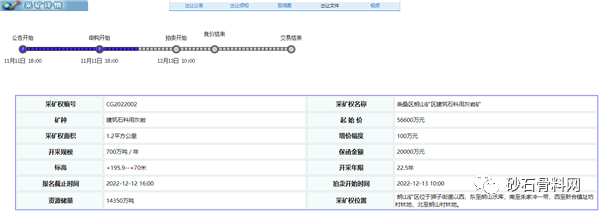 據(jù)了解,朗山礦區(qū)位于獅子街道以西,距柴桑區(qū)城區(qū)約10千米。此外,該礦區(qū)采礦權(quán)為無底價拍賣,開采方式為露天開采,開采標高195.9米至265.9米。出讓年限22.5年,其中基建期2年,生產(chǎn)期20.5年。網(wǎng)上報名時間2022年11月11日至2022年12月12日,拍賣開始時間2022年12月13日。