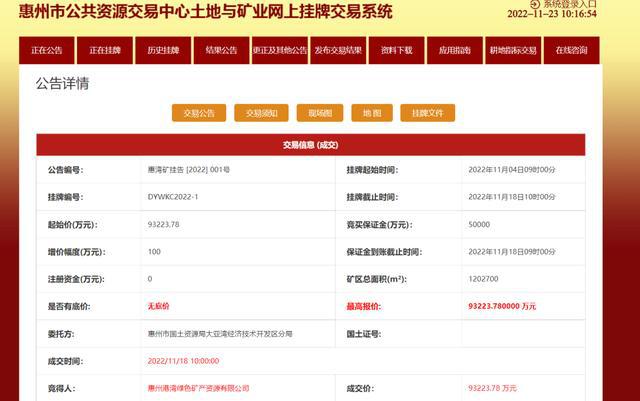 2022年08月25日,廣東省惠州市成功出讓惠東縣平海鎮(zhèn)寨頭礦區(qū)10642.55萬立方米(近3億噸)建筑用花崗巖礦采礦權(quán)。擬出讓年限:30年,成交價(jià)15.90億元,生產(chǎn)規(guī)模380萬方米/年(超1000萬噸/年)。最終由惠州交投平海綠色石場有限公司競得。