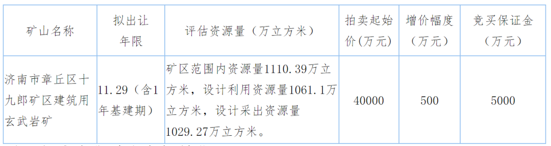 近日,山東濟(jì)南出讓資源量1110萬(wàn)方建筑用玄武巖礦,起拍價(jià)4億元,出讓年限11.29(含1年基建期)。根據(jù)出讓文件規(guī)定:本次出讓采礦權(quán)是競(jìng)得人在該礦區(qū)范圍內(nèi)依法開(kāi)采礦產(chǎn)資源的權(quán)利,涉及生態(tài)環(huán)境、應(yīng)急、水利、林業(yè)、自然資源、行政審批服務(wù)局等多個(gè)部門(mén)管理職責(zé),競(jìng)得人須按相關(guān)部門(mén)規(guī)定自行辦理相關(guān)手續(xù),其費(fèi)用由競(jìng)得人承擔(dān)。