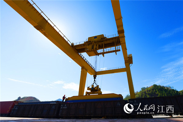 12月11日,在江西省贛州市定南港,塔吊工人正將一節(jié)節(jié)滿載集裝箱貨物的車廂起吊串聯(lián),一個(gè)小時(shí)后,這列搭載集裝箱的火車將開往深圳鹽田港,隨后通過海運(yùn)將貨物出口國(guó)外。