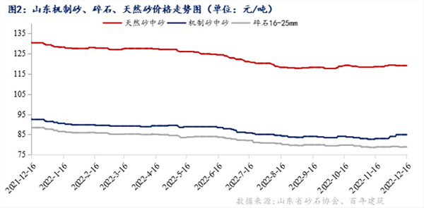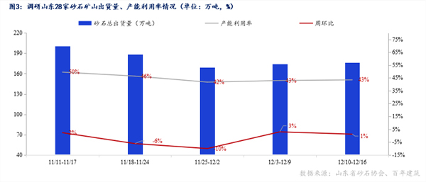 分品種來看,山東機制砂均價為84.9元/噸,較上周持平;碎石均價79.2元/噸,較上周上漲0.4元/噸;天然砂均價119.3元/噸,較上周上漲0.2元/噸。需求端:受冷空氣影響,部分重點工程項目趕工期外,其他項目進度受阻,加之勞務人員流動性降低,因此項目直供量及攪拌站采購砂石量增幅收窄。供應端:12月16日,調研山東砂石生產企業(yè)28家,產線共43條,正常開機27條,開機率為63%,較上周增加5個百分點。物流運輸恢復,砂石礦山生產線開機率持續(xù)好轉,預計下周山東砂石產線開機率保持平穩(wěn)。
