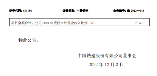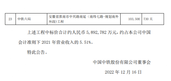 中國(guó)中鐵中標(biāo)價(jià)合計(jì)約人民幣589億元,約占公司2021年?duì)I業(yè)收入的5.51%。