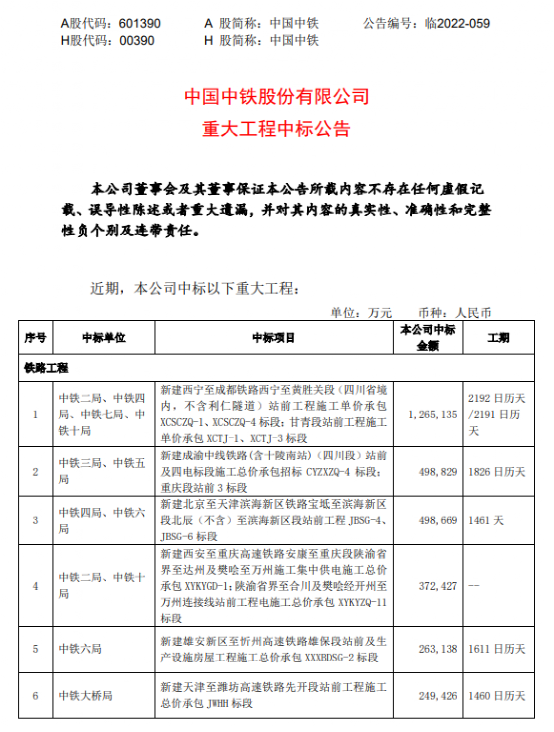 中國(guó)中鐵、中國(guó)鐵建中標(biāo)重大工程項(xiàng)目合計(jì)1261億元
