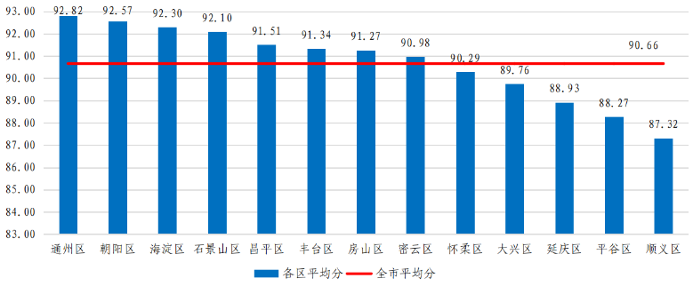從各區(qū)評(píng)估得分情況來(lái)看,現(xiàn)場(chǎng)評(píng)估平均分較高的為通州區(qū)、朝陽(yáng)區(qū)、海淀區(qū),分?jǐn)?shù)較低的為平谷區(qū)和順義區(qū)。
