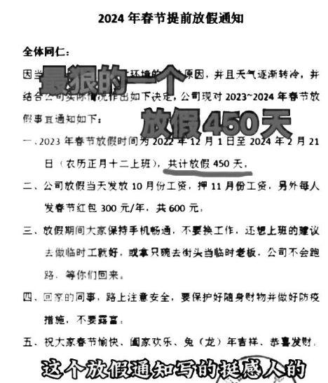 廣東某企業(yè)的一則《2024年春節(jié)提前放假通知》刷爆全網(wǎng),該企業(yè)表示,春節(jié)放假時間自2022年12月1日至2024年2月21日,放假450天。