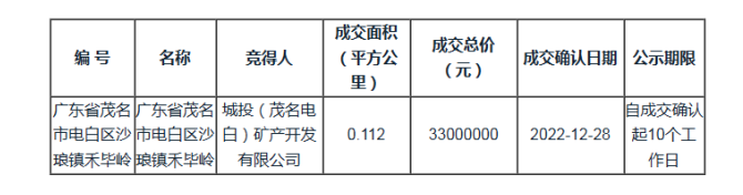 2、廣東省茂名市電白區(qū)沙瑯鎮(zhèn)禾畢嶺:競得人城投(茂名電白)礦產(chǎn)開發(fā)有限公司,成交價:3300萬元。