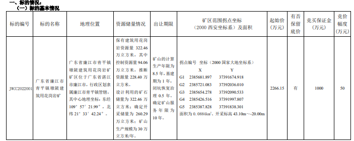 開 采 標(biāo) 高 +199m ~ 0m , 礦 區(qū) 面 積 為 0.112km㎡;開 采 礦 種 :建 筑 用 花 崗 巖 礦 ;綜合利用:中風(fēng)化花崗巖;開采方式:露天開采;出讓資源儲量:保有建筑用花崗巖礦石量 593.07萬m?;礦區(qū)總剝離量約為 294.95 萬m?;確定礦區(qū)可采建筑用花崗巖礦石量 437.30 萬m?;綜合利用剝離層可采儲量為 207.45 萬m?;礦山設(shè)計生產(chǎn)規(guī)模 30 萬m?/年;采礦權(quán)出讓期限:16.5 年,包含基建期與閉坑期各 1 年,自頒發(fā)采礦許可證之日算起;采礦權(quán)出讓底價:無底價出讓;掛牌起始價:人民幣 3300 萬元。