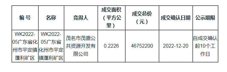 4、WK2022-05廣東省化州市平定鎮(zhèn)蓬利礦區(qū):競得人茂名市茂盛公共資源開發(fā)有限公司,成交價:4675.22萬元。