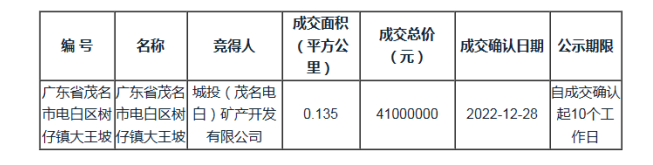 1、廣東省茂名市電白區(qū)樹仔鎮(zhèn)大王坡 :競得人城投(茂名電白)礦產(chǎn)開發(fā)有限公司,成交價:4100萬元。