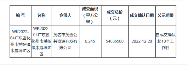 3、WK2022-04廣東省化州市播揚鎮(zhèn)木威坑礦區(qū):競得人茂名市茂盛公共資源開發(fā)有限公司,成交價:5483.55萬元。