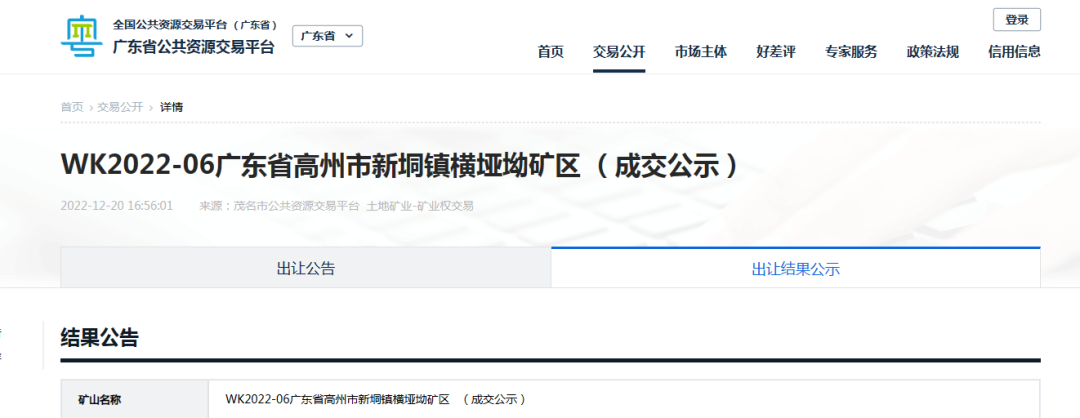 5、WK2022-06廣東省高州市新垌鎮(zhèn)橫埡坳礦區(qū):競得人茂名市茂盛公共資源開發(fā)有限公司,成交價:14425.72萬元。