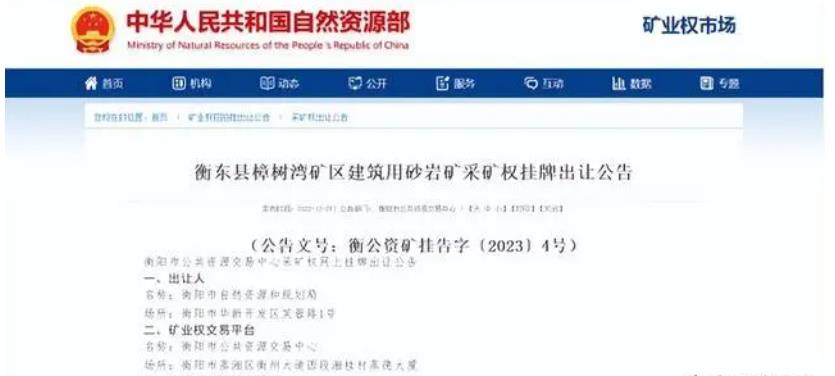 礦區(qū)位于湖南省衡東縣甘溪鎮(zhèn)新沖村,礦區(qū)面積0.116平方千米,開采礦種屬于建筑用白云巖。資源儲(chǔ)量達(dá)787.02萬噸,開采標(biāo)高在+246米至+187米。出讓年限10.8年,起始價(jià)3798.33萬元。申請(qǐng)報(bào)名的起止時(shí)間在2022年12月26日—2023年01月29日日,掛牌時(shí)間在2023年01月30日—2023年02月10。