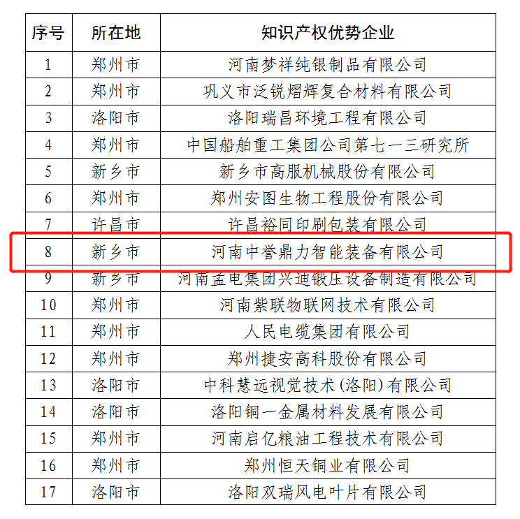 近日,河南省知識(shí)產(chǎn)權(quán)局公示了“2022年度河南省知識(shí)產(chǎn)權(quán)強(qiáng)企備案名單”。河南中譽(yù)鼎力智能裝備有限公司憑借先進(jìn)的技術(shù)研發(fā)創(chuàng)新和知識(shí)產(chǎn)權(quán)管理實(shí)力,成功入選“2022年度河南省知識(shí)產(chǎn)權(quán)優(yōu)勢(shì)企業(yè)”!