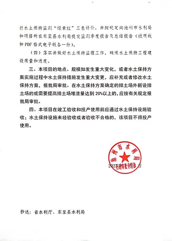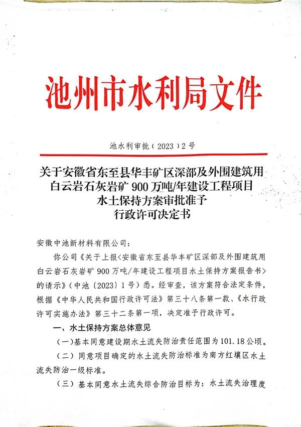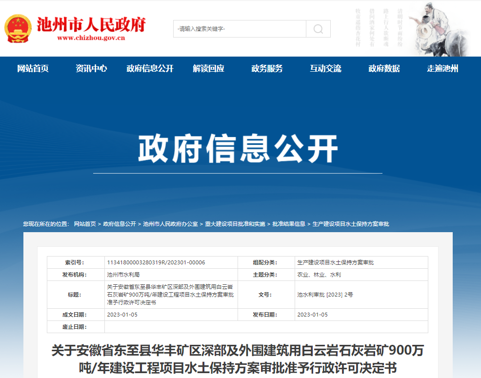 近日,安徽省池州市水利局發布了《關于安徽省東至縣華豐礦區深部及外圍建筑用白云巖石灰巖礦900萬噸/年建設工程項目水土保持方案審批準予行政許可決定書》。