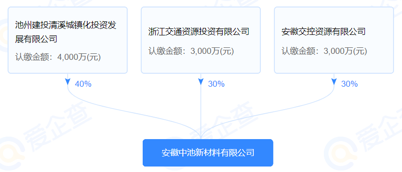 安徽中池新材料有限公司為2022年1月成立的一家國有企業,注冊資本一億元,由池州建投清溪城鎮化投資發展有限公司(控股40%)、安徽交控資源有限公司(控股30%)、浙江交通資源投資有限公司(控股30%)三家企業共同投資設立。