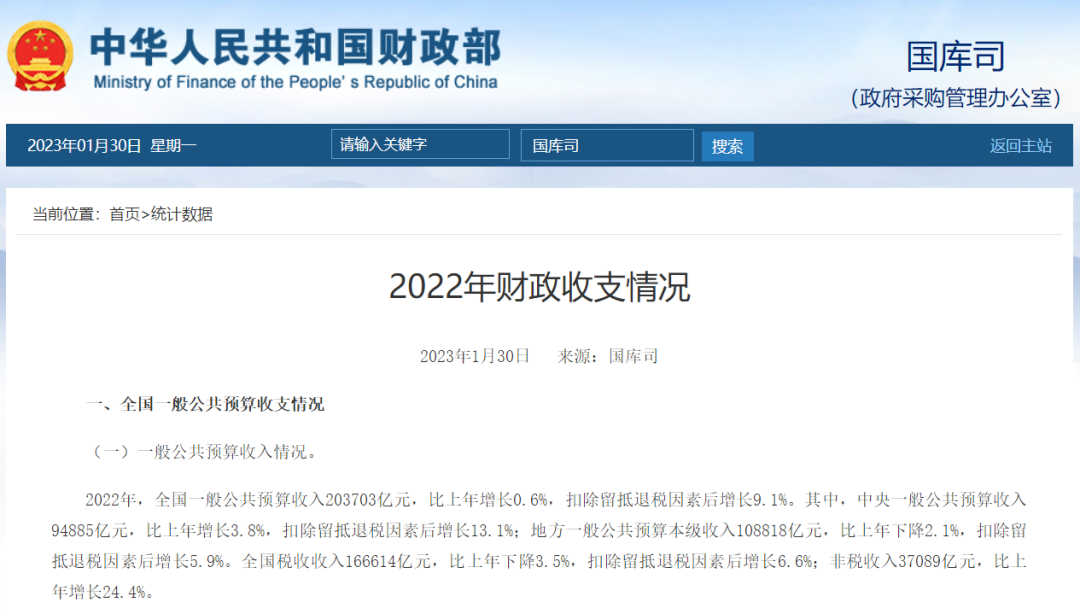 “真金白銀”的全國財政數據終于“出爐”。財政部30日發布數據顯示,2022年全國一般公共預算收入增速艱難轉正,共計203703億元,比上年增長0.6%,扣除留抵退稅因素后增長9.1%。并呈現出全年收支緊平衡;非稅收入快于稅收收入(主要包括礦產資源收入增加,拉高地方非稅收入增幅14.3個百分點);房地產相關稅收和土地財政是主要拖累項;支出重點向民生、基建和抗疫傾斜等特點。