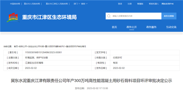日前,重慶市江津區生態環境局發布冀東水泥年產300萬噸高性能混凝土用砂石骨料項目環評決定公示。該項目總投資9000萬元,建設單位為冀東水泥重慶江津有限責任公司。據了解,企業配套礦山許可證未增列建筑石料用灰巖前,僅能通過外購建筑用骨料作為原料。
