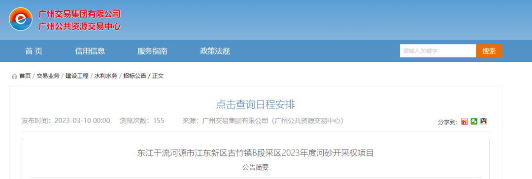 廣東省河源江東新區農林水務局發布東江干流河源市江東新區古竹鎮B段采區2023年度河砂開采權項目招標公告。
