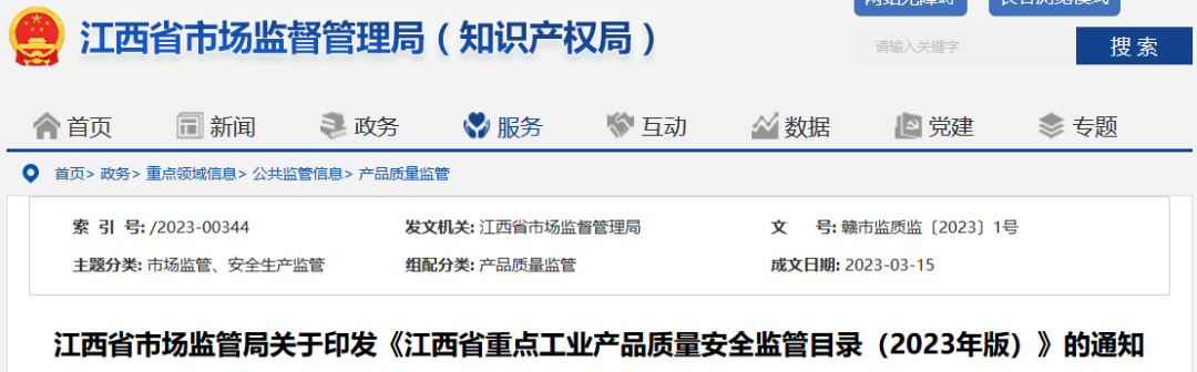 江西省市場監管局關于印發《江西省重點工業產品質量安全監管目錄(2023年版)》的通知