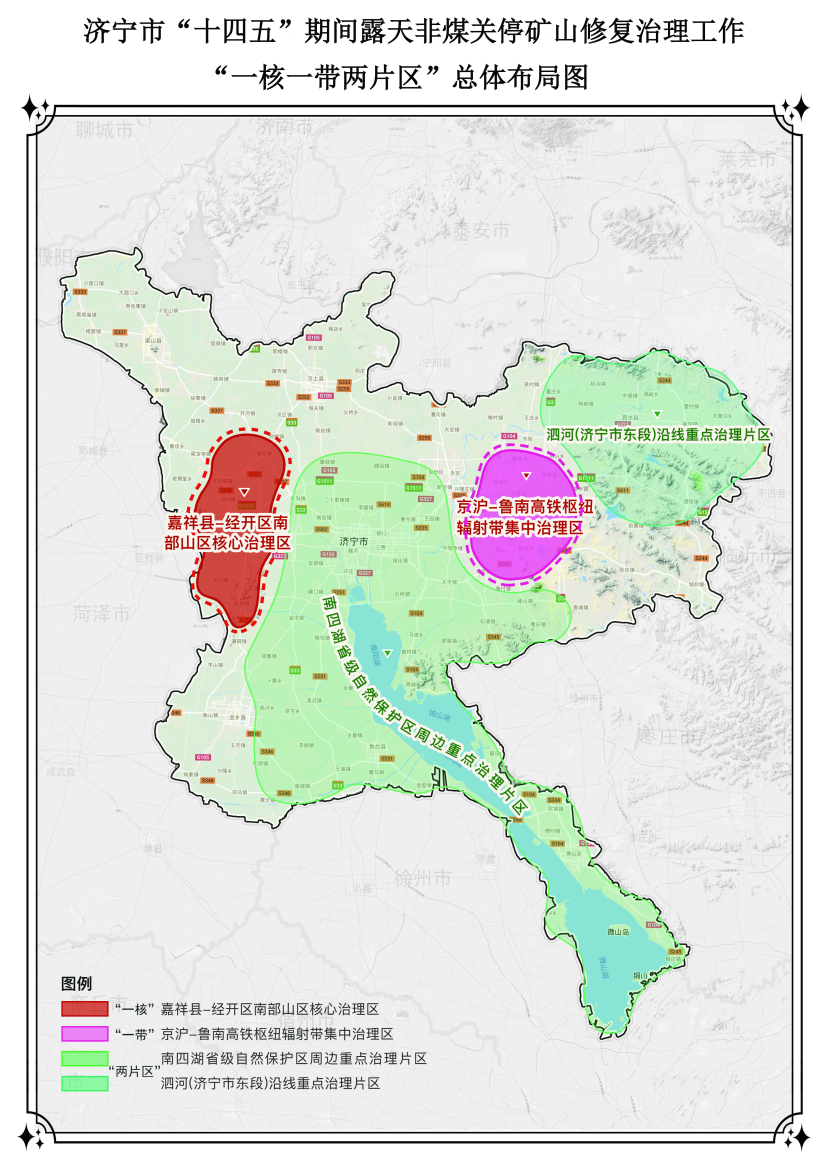 依據(jù)全國(guó)歷史遺留礦山核查成果認(rèn)定數(shù)據(jù),結(jié)合濟(jì)寧實(shí)際,全市構(gòu)建了“一核、一帶、兩片區(qū)”的礦山修復(fù)治理工作總體格局,“一核”即嘉祥縣—經(jīng)開(kāi)區(qū)南部山區(qū)核心治理區(qū)、“一帶”即京滬-魯南高鐵樞紐輻射帶集中治理區(qū)、“兩片區(qū)”即南四湖省級(jí)自然保護(hù)區(qū)周邊重點(diǎn)治理片區(qū)和泗河(濟(jì)寧市東段)沿線重點(diǎn)治理片區(qū),劃分礦山修復(fù)重點(diǎn)區(qū)域,明確近遠(yuǎn)期重點(diǎn)工作,有的放矢推進(jìn)全市礦山修復(fù)治理工作進(jìn)程。2022年,全市聚焦“一核”治理任務(wù),組織嘉祥縣、微山縣、經(jīng)開(kāi)區(qū)謀劃包裝面積超1.5萬(wàn)畝、總投資達(dá)8.85億元的礦山修復(fù)重大項(xiàng)目,并以全國(guó)第4名、全省唯一的成績(jī),獲得中央財(cái)政無(wú)償資金3億元,是2022年濟(jì)寧市爭(zhēng)取資金最多的單個(gè)項(xiàng)目。2023年,全市聚焦“兩片區(qū)”治理任務(wù),組織鄒城市、泗水縣謀劃包裝2處面積超1500畝、總投資超5000萬(wàn)元的礦山修復(fù)重大項(xiàng)目,全部進(jìn)入礦山修復(fù)重大項(xiàng)目省財(cái)政支持范圍,獲批省財(cái)政資金6000萬(wàn)元(現(xiàn)已到位3800萬(wàn)元)。