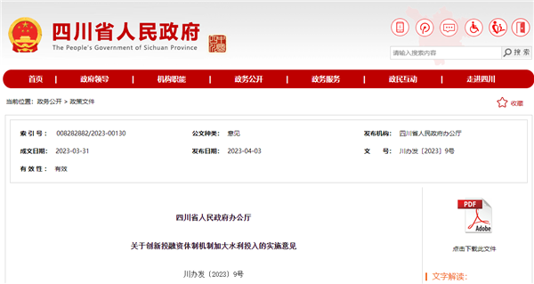 據(jù)了解,該《意見》是繼2023年1月份,中共四川省委、四川省人民政府出臺的《關(guān)于進(jìn)一步加強(qiáng)水利工程建設(shè)保障經(jīng)濟(jì)社會高質(zhì)量發(fā)展的意見》后的又一推進(jìn)水利工程建設(shè)的利好政策。