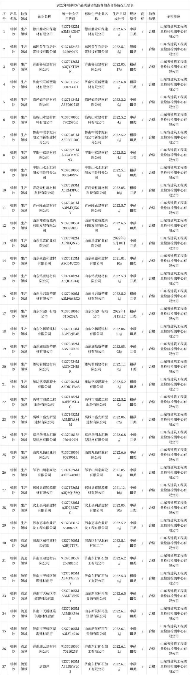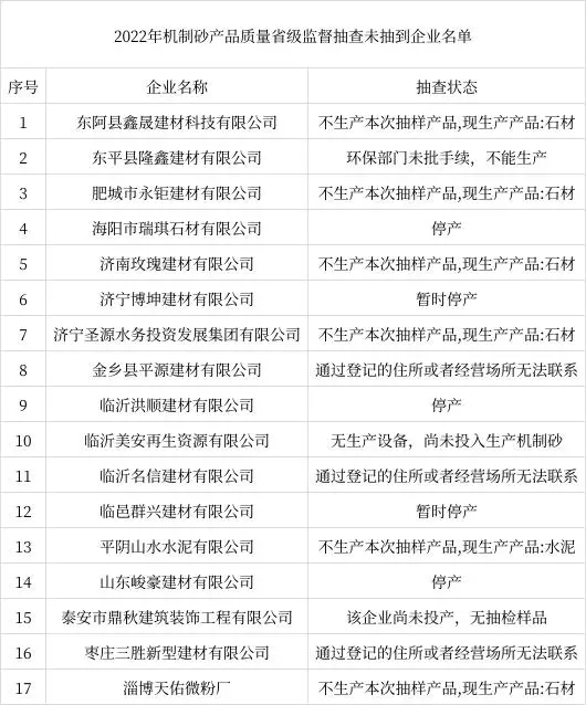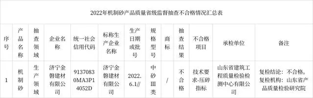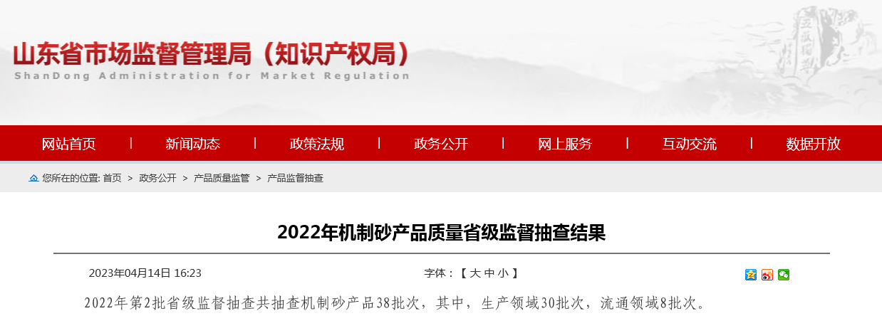 2023年4月14日,山東省市場監督管理局網站公布2022年機制砂產品質量省級監督抽查結果。