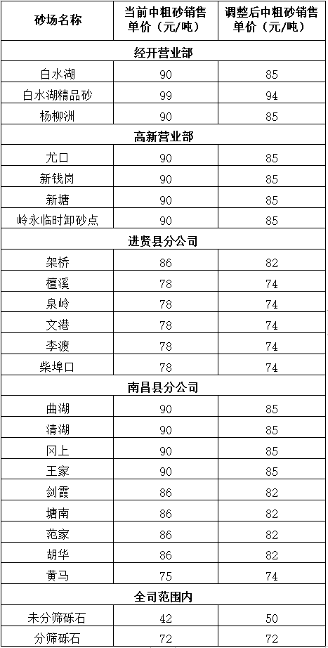 南昌贛昌砂石有限公司自2023年4月15日0時起,對各營業(yè)部、分公司砂場砂石銷售價格與銷售政策做出如下調(diào)整: 一、中粗砂、礫石銷售價格調(diào)整:   注:以上價格均含裝載費(fèi) 二、在調(diào)..