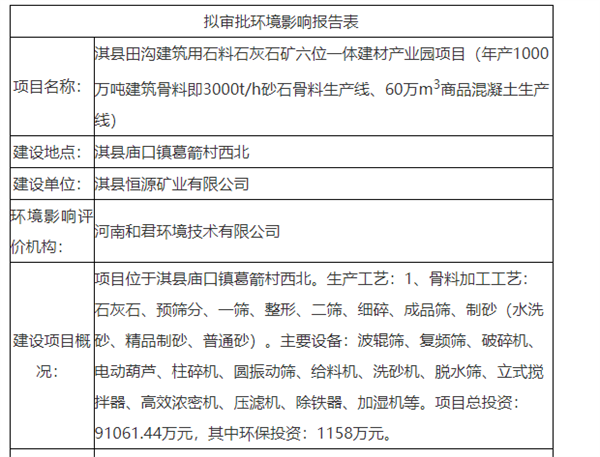 4月17日,河南鶴壁市生態(tài)環(huán)境局發(fā)布擬對淇縣恒源礦業(yè)有限公司淇縣田溝建筑用石料石灰石礦六位一體建材產(chǎn)業(yè)園項(xiàng)目(年產(chǎn)1000萬噸建筑骨料即時(shí)產(chǎn)3000砂石骨料生產(chǎn)線、60萬方商品混凝土生產(chǎn)線)環(huán)境影響評價(jià)文件作出審批意見的公示。