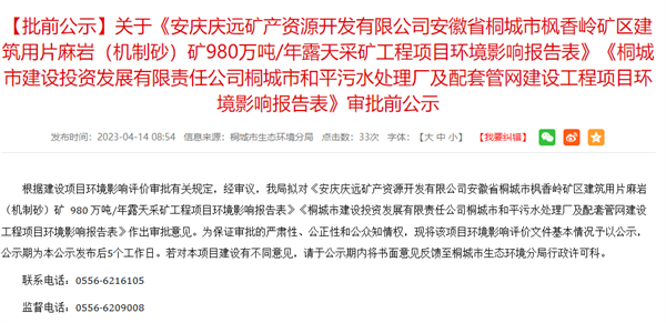4月14日,安徽省桐城市生態(tài)環(huán)境分局發(fā)布《安慶慶遠(yuǎn)礦產(chǎn)資源開發(fā)有限公司安徽省桐城市楓香嶺礦區(qū)建筑用片麻巖(機(jī)制砂)礦980萬噸/年露天采礦工程項(xiàng)目環(huán)境影響報(bào)告表》審批前公示。