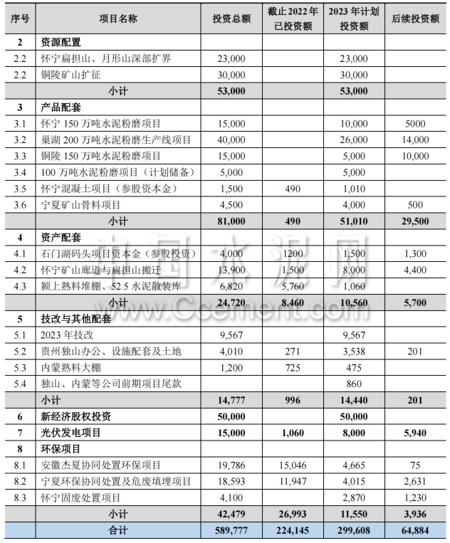 備注說明:上表中廣西都安項(xiàng)目、貴州都勻項(xiàng)目、諸暨項(xiàng)目、資源配置類項(xiàng)目、銅陵和懷寧年產(chǎn) 150 萬噸水泥粉磨項(xiàng)目、石門湖碼頭項(xiàng)目、懷寧礦山廊道與扁擔(dān)山搬遷、新經(jīng)濟(jì)股權(quán)投資等項(xiàng)目,已經(jīng)之前的董事會(huì)或股東大會(huì)審議通過,此表為2023年度總體投資計(jì)劃。