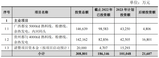 建設(shè)內(nèi)容及規(guī)模:貴州都勻項(xiàng)目主要建設(shè)內(nèi)容為新建一條 4000t/d智能化水泥熟料生產(chǎn)線及配套粉磨項(xiàng)目、水泥窯協(xié)同處置等系列項(xiàng)目。投資金額:預(yù)計(jì)總投資額為 308,801 萬元,其中2023年計(jì)劃投資101,048萬元。