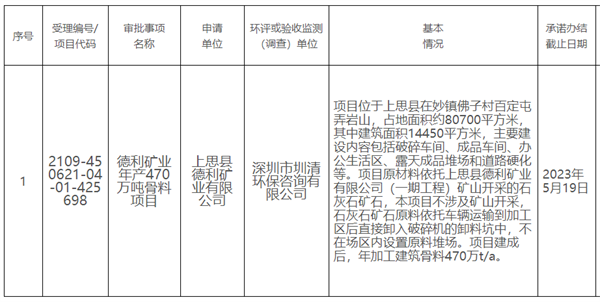 日前,廣西防城港市上思生態(tài)環(huán)境局對德利礦業(yè)年產470萬噸骨料項目進行環(huán)評公示。該項目位于廣西防城港市上思縣妙鎮(zhèn)佛子村百定屯弄巖山,不涉及礦山開采。其原材料依托德利礦業(yè)石灰石礦,..