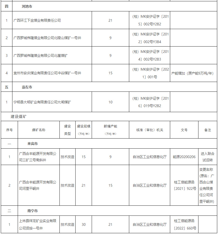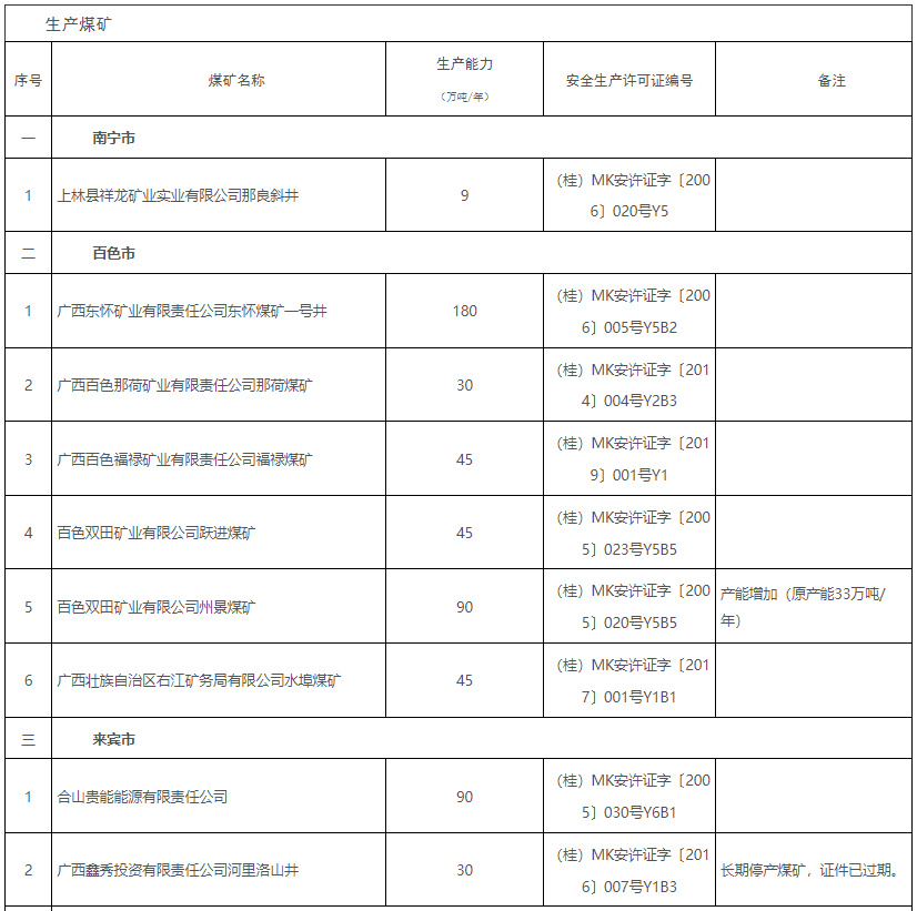 廣西發改委日前發布的公告顯示,截至2023年3月31日,全區有依法生產建設煤礦17處,產能規模694萬噸/年。 其中,生產煤礦14處,登記生產能力628萬噸/年;建設煤礦3處,建設規模66萬噸/年。 從公告來看,年產能在百萬噸以上的煤礦僅有1處,45萬噸及以上的有9處,15萬噸以及下的有7處。
