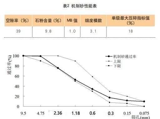 經(jīng)檢測,采用該隧道洞渣加工的機制砂無堿活性,機制砂性能與露天開采巖石加工的砂石料無異。對照《建設(shè)用砂》,該機制砂滿足Ⅱ類砂要求(空隙率不大于44%,單級最大壓碎指標(biāo)值不大于25%,MB值小于1.4時石粉含量不大于10%)。